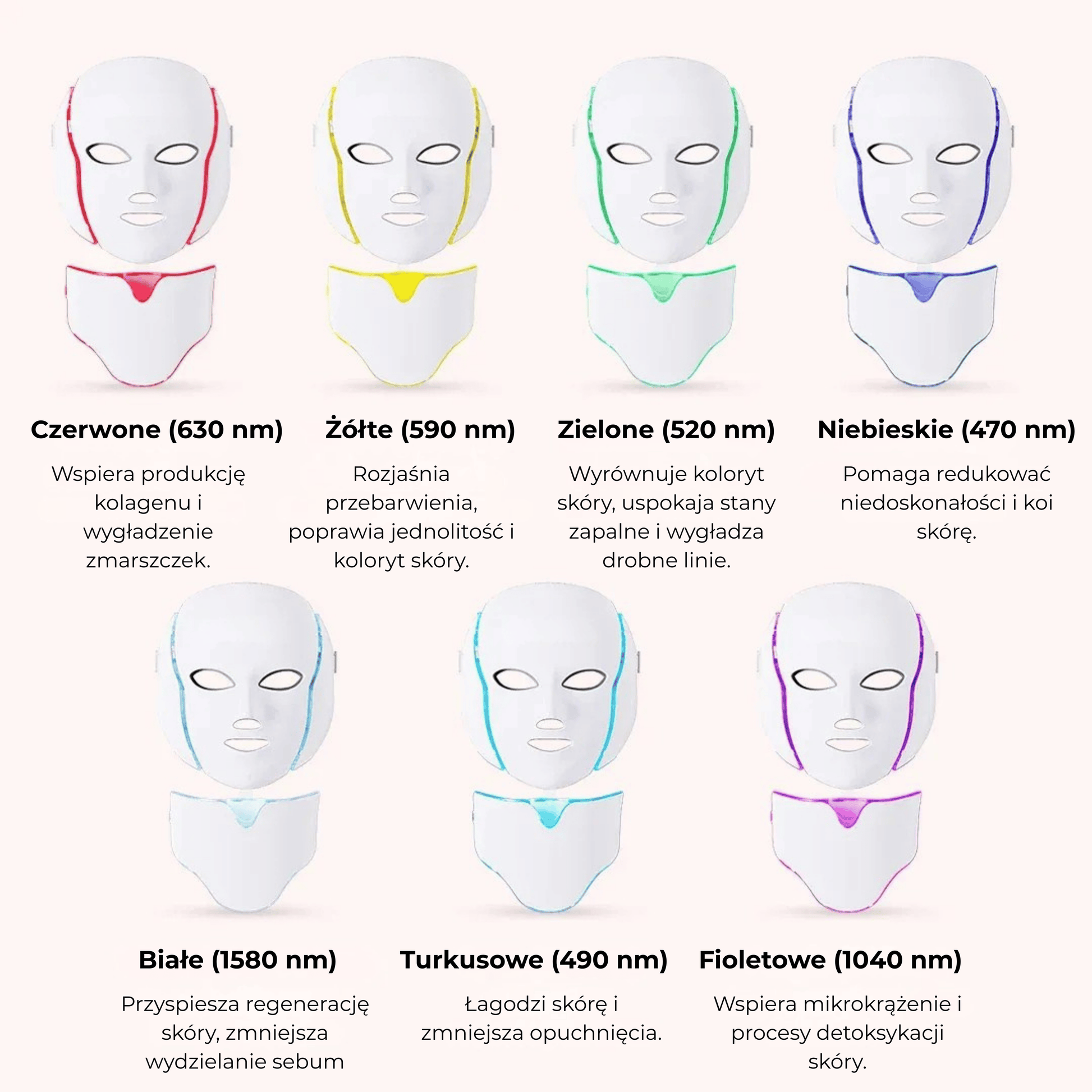 Maska LED została wyposażona w 7 trybów światła, które wspierają wygładzenie skóry, poprawę jędrności oraz wyrównanie kolorytu - delikatnie i komfortowo.